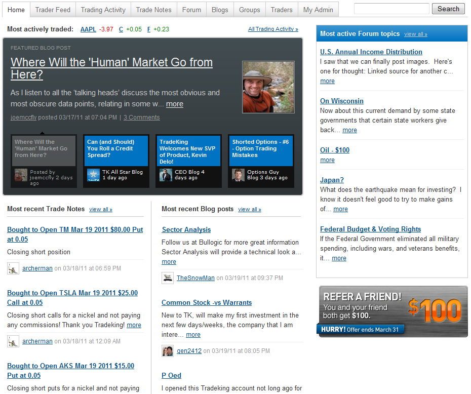 Trader Network is TradeKing's take on social networking. Included in this section are ways to track the market activity of fellow traders, forums, blogs and groups. Here is a look at the main page: